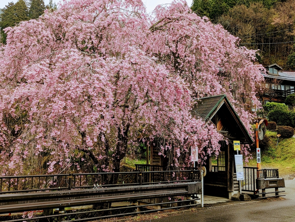 しだれ桜満開の「人里バス停」