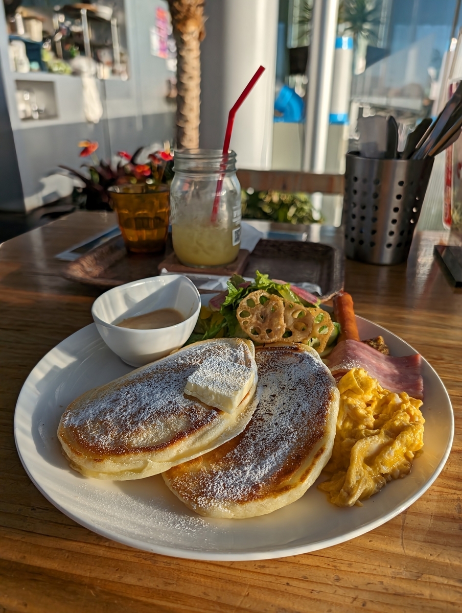 モーニングメニューがあるわけではなく早朝からレギュラーメニューでたっぷりのパンケーキとパイナップルジュースをいただきました。